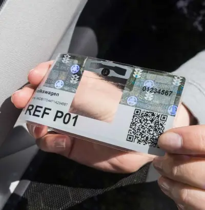 Printed information is sealed between holographic and transparent foil with full adhesive front facing the windshield.